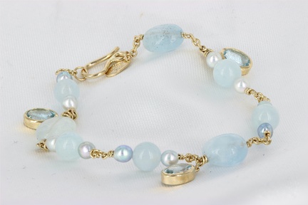 - Armbånd med 3 ovale topaser sat i rørfatning, 8 akvamariner i 2 størrelser samt 10 akoya perler