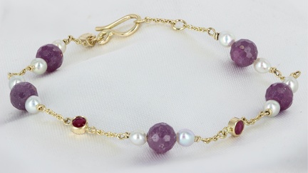 - Armbånd med 2 rubiner sat i rørfatning, 5 facetteret rubin perler samt 10 akoya perler
